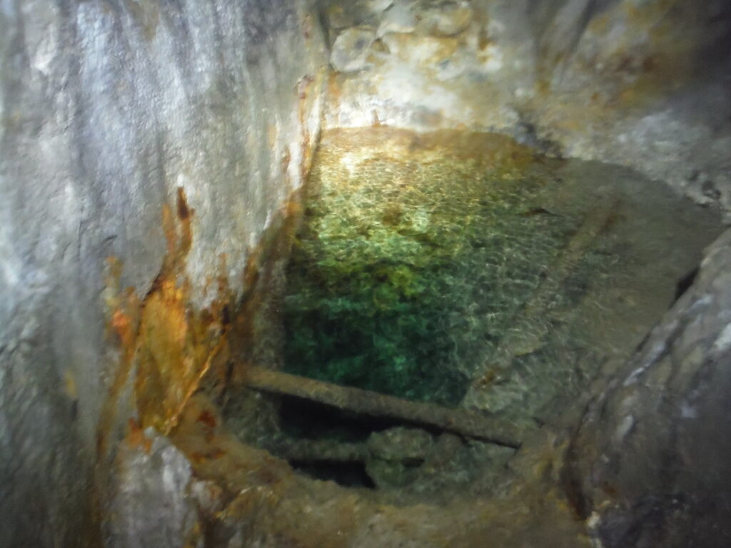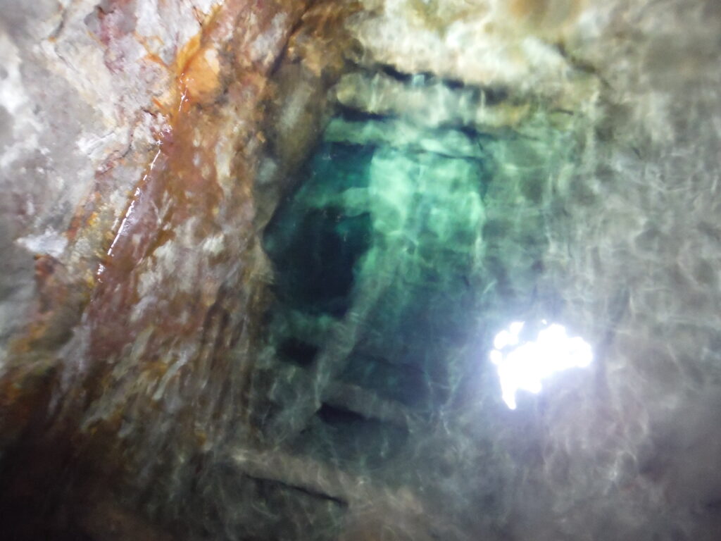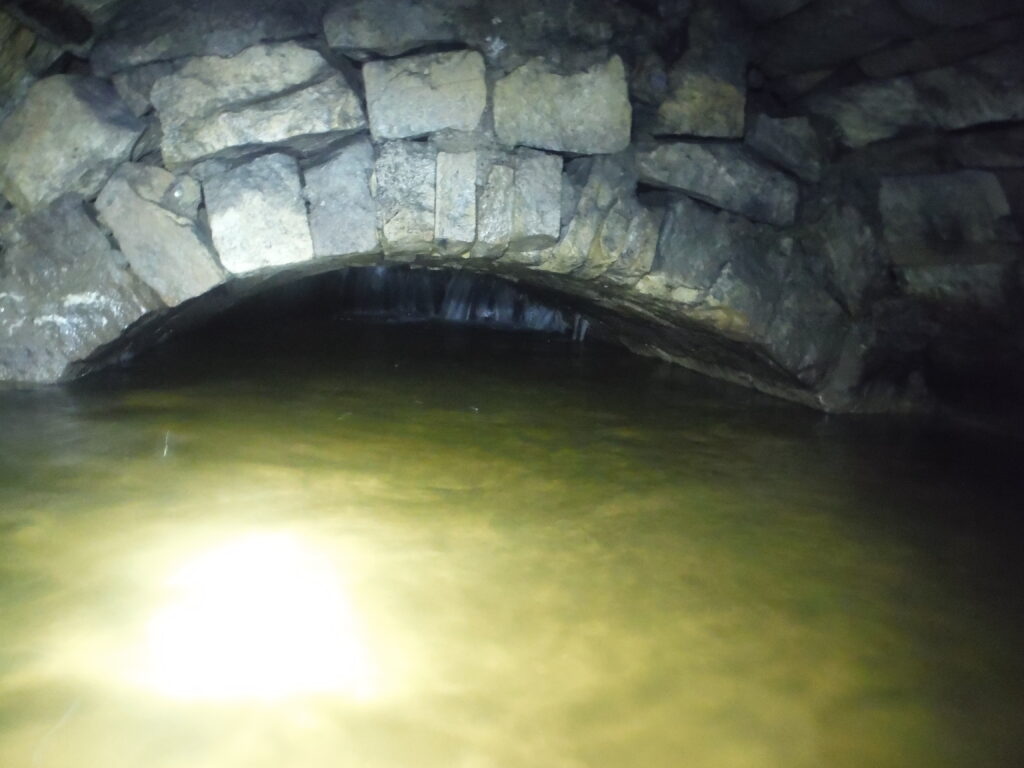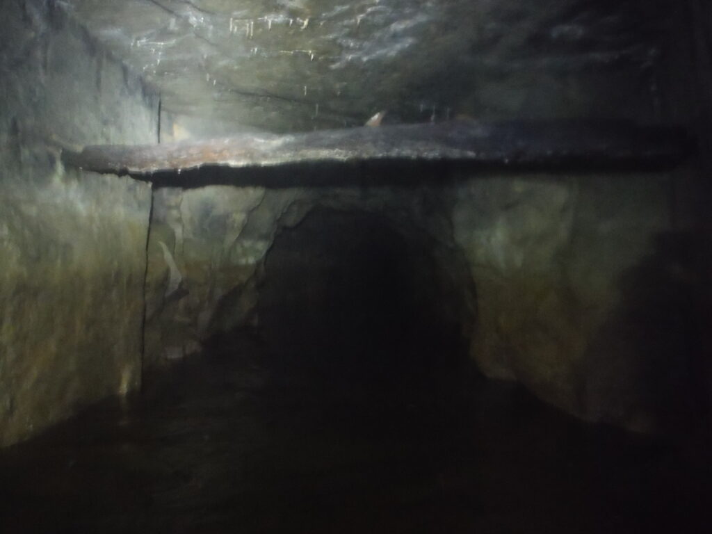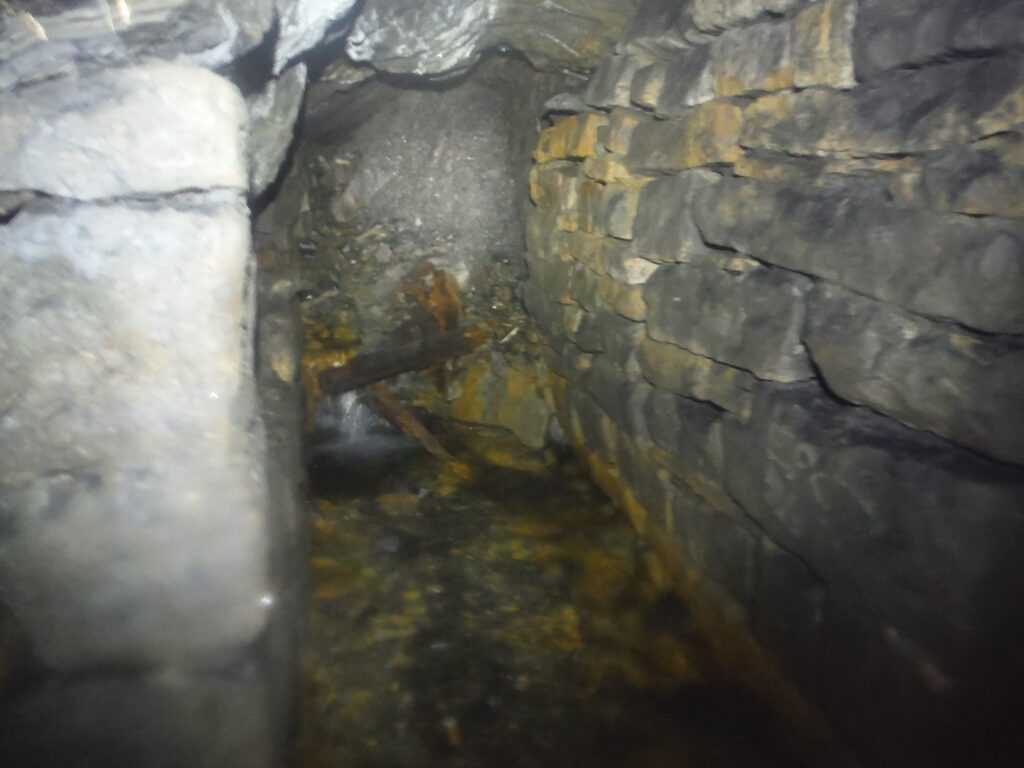 The passage has no notable features apart from a couple of stacks of deads and one large piece of wood wedged above head height, however there are numerous shot holes and what looks to be candle holders at certain points along the level. Eventually you come to a point where the passage angles off to the right and after following this for a few minutes, an arch of deads forms the passage roof. Off to the left is the only deviation in the level where a passage can be followed for around 5 metres before reaching a blue coloured sump. From looking at the underground map of the area in British Mining 46, It is believed this is the sump which connects to Beever, mine and the rest of the mines around Yarnbury to provide drainage.