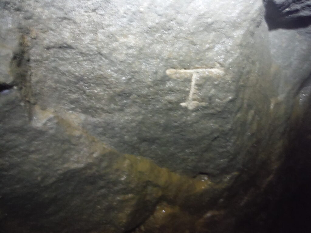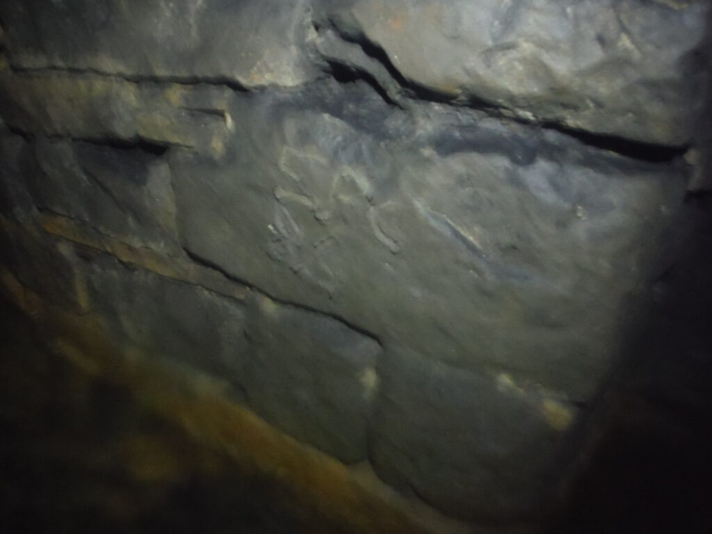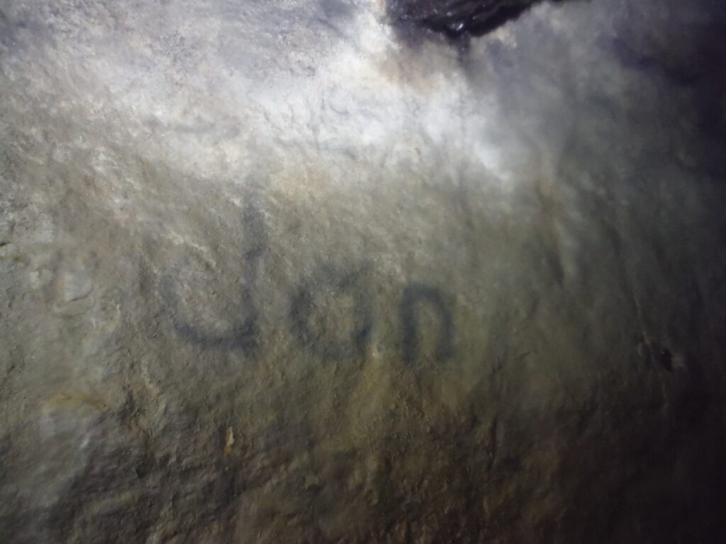 Continuing near to the end of the adit, there is a short left hand passage to the left leading immediately to a collapse. Here inscribed on the wall are the letters EPC 86 written in mud. As of April 2020, it was discovered that the individual who inscribed this note on the wall was John Southworth a longstanding member of the Earby Pothole Club.