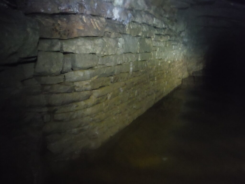 The main passage continues and a number of steel bands are incorporated into the dry stone arching in order to support it. From here, the passage becomes less stable and large sections of the roof have collapsed. The rock seems to be some sort of shale, with layers that peel off from the roof and walls. You can still walk along the passage but there are sections where you have to stoop.