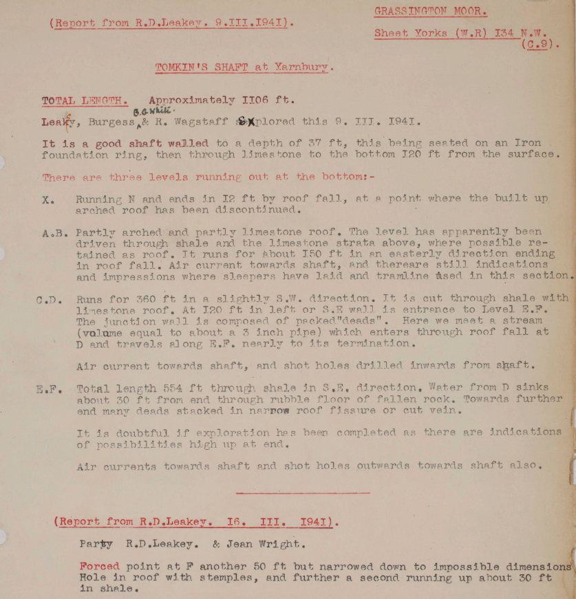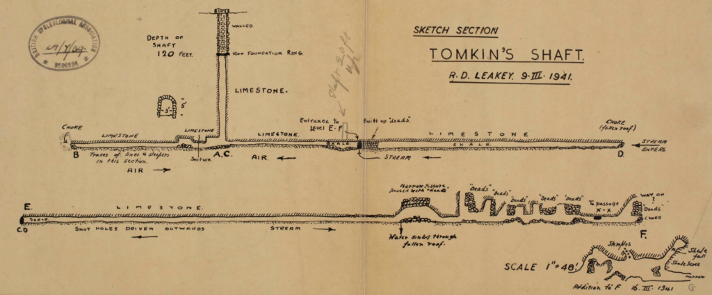 In 1941, members of the British Speleological Association explored Tonkin’s shaft and recorded around 337 metres of passage. At the bottom of the shaft they found three levels running North, East and South East, with a further passage connected to the South East level continuing back towards Yarnbury. All the levels were eventually blocked with roof fall, however compared to a lot of the mine shafts across Grassington Moor this mine contained a significant amount of accessible passages. The BSA produced a detailed survey of Tonkin’s shaft, however they incorrectly named it as Tomkin’s shaft. One interesting feature was the iron frame installed to support the dry stone collar that formed the top section of the shaft, as most mines across Grassington either used a wooden collar or erected the stonework directly on top of solid limestone.