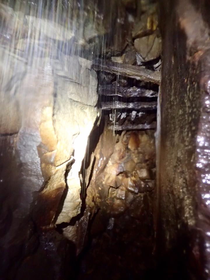 Future descents into the mine are not advised. The bottom of the stone collar at the top of the shaft was in a poor state, and any disturbance to the base could cause the whole lining to cave in. Furthermore, the false floors were propped up with extremely rotten timbers and there has been a large number of collapses throughout the entire mine.